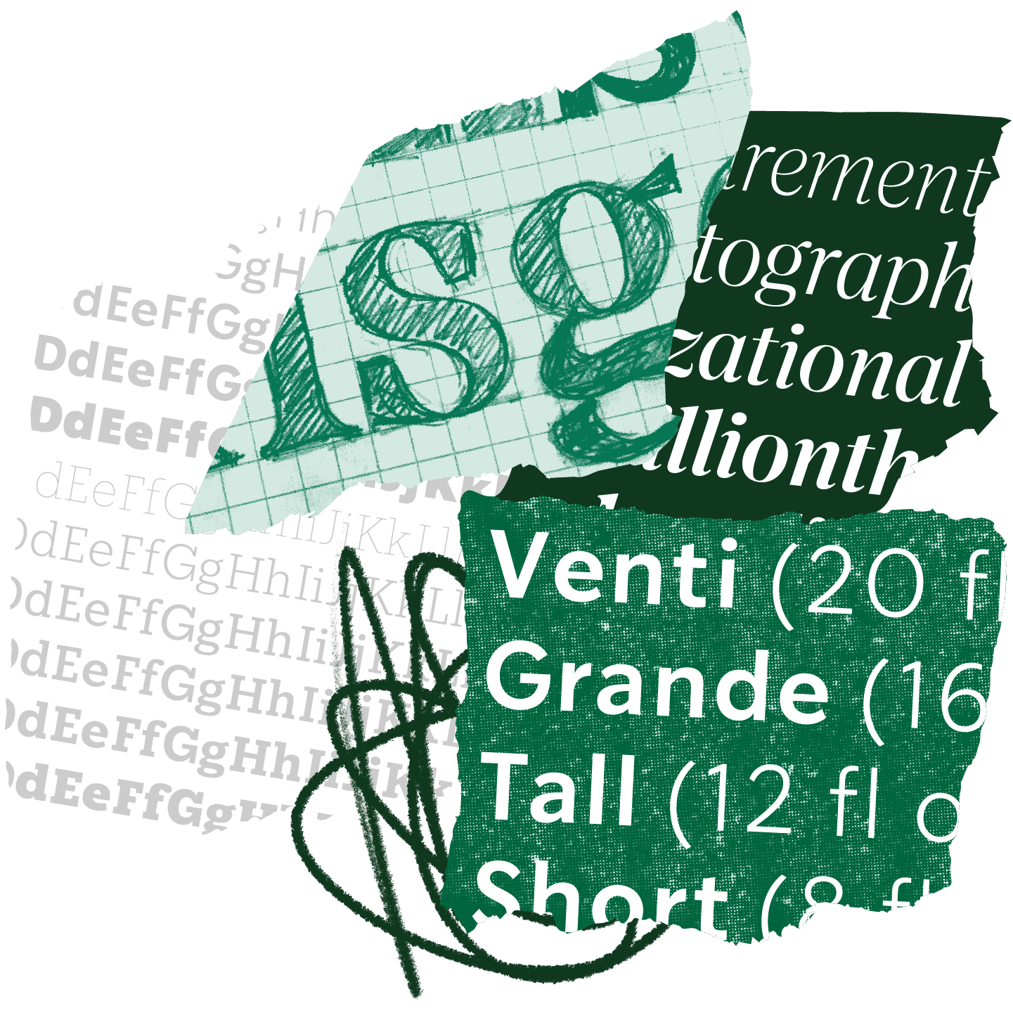 The thin hairlines of Lander Grande help the design to feel sparkly and fancy at large sizes. In text, the 'Short' optical size translates the same letterforms to smaller sizes via thicker hairlines, wider proportions, and other small adjustments. Then you've got the 'Tall' optical size, splitting the difference, for the uses in-between. For every roman style, Lander has an italic companion. I am very fond of the true italic I drew for Lander, and the way the roman and italic get along. The italic has much more expressive details, and retains the double storey 'g'. One of my favorite details is the way that the 'v' and 'w' make use of the teardrop in the italic. Particularly with a project of this scale, it takes a team. In order to get every glyph drawn and in its right place, I enlisted help from Danelle Cheney (who worked on intricate oblique corrections for the italics), Dan Gneiding (who worked on punctuation/symbol drawings for SoDo Sans and SoDo Serif), and Dave Bailey (who contributed production work to all of the typefaces we would eventually design for Starbucks).